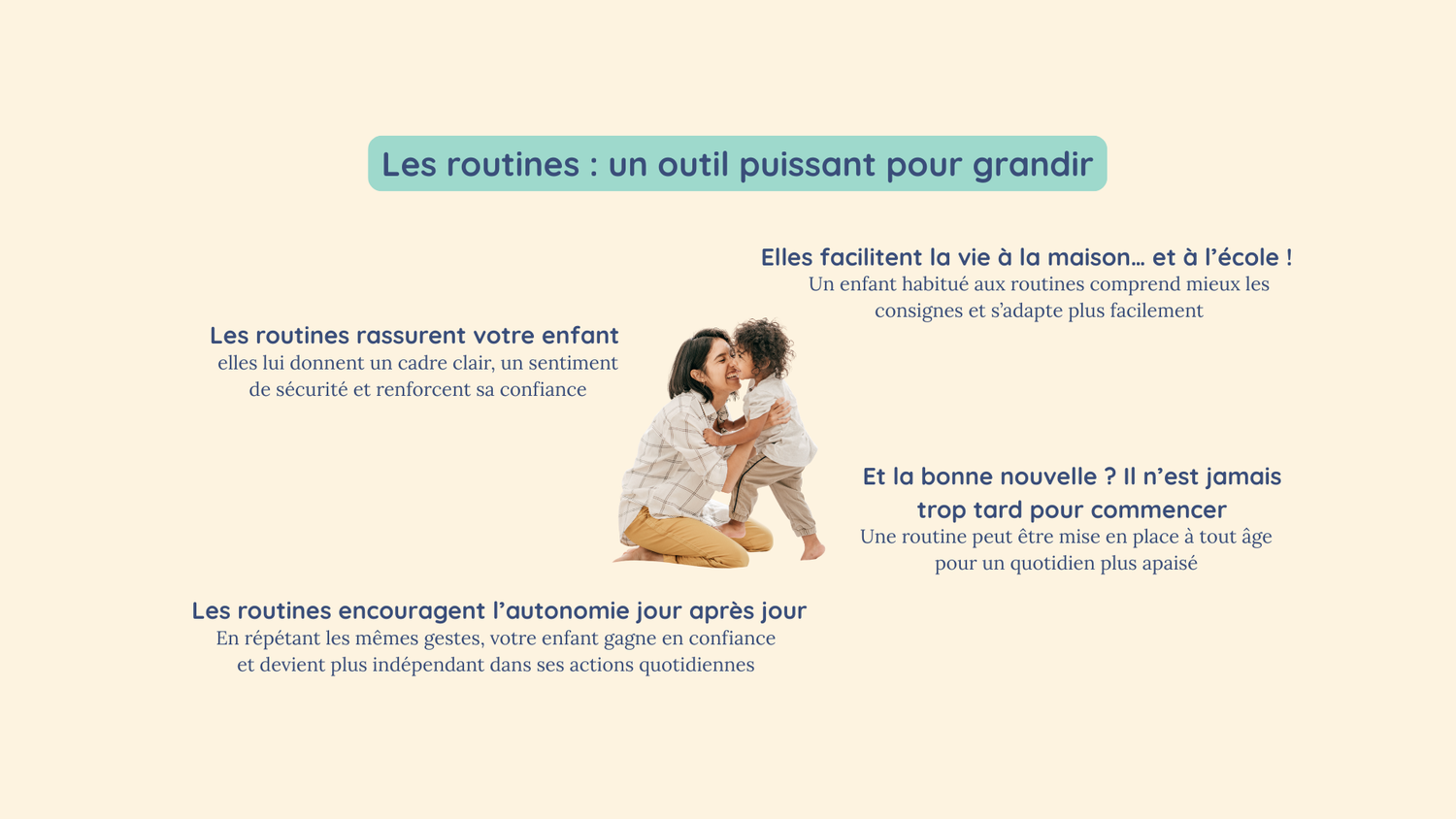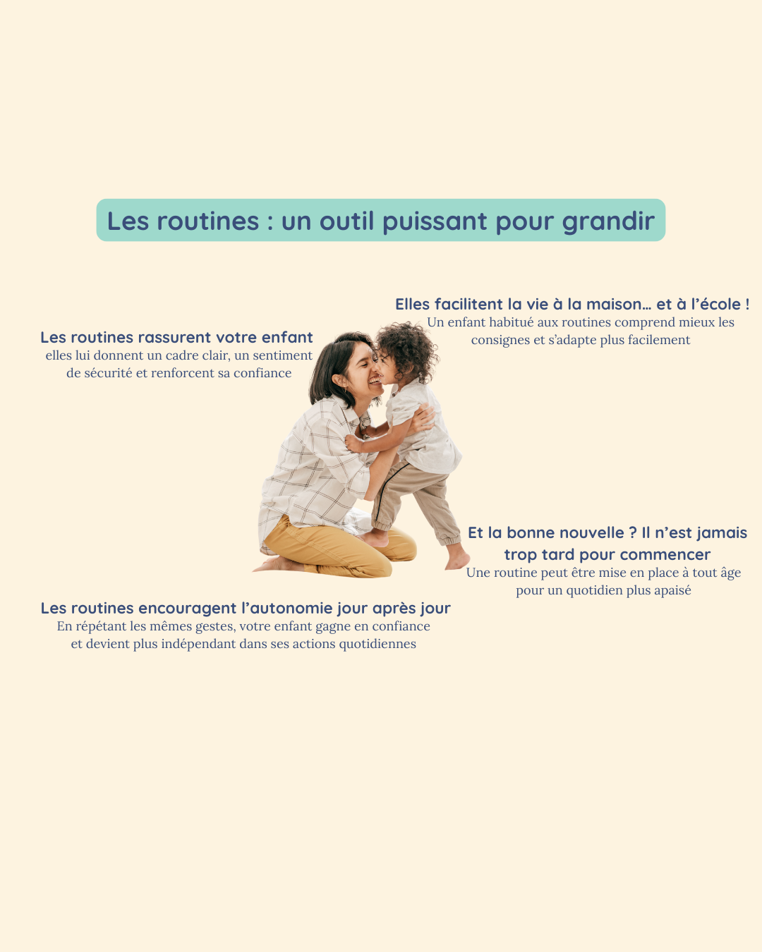 "La journée d’un enfant est rythmée par des routines, c’est-à-dire des gestes et des événements qui reviennent chaque jour dans le même ordre et, souvent, à la même heure. Plus son quotidien est prévisible, plus votre enfant se sent en sécurité."